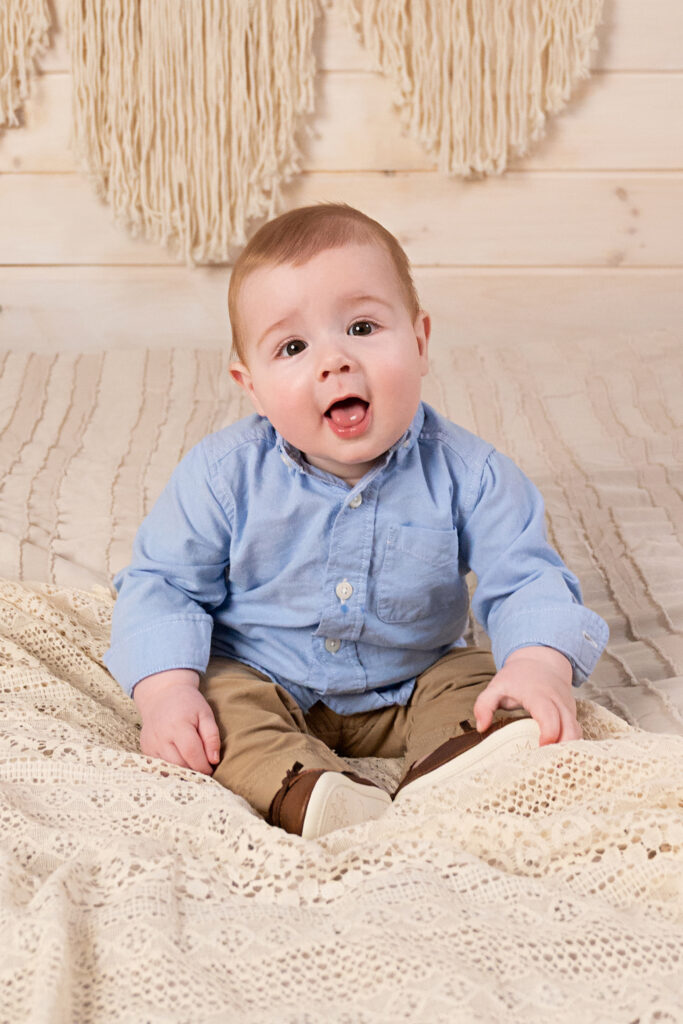 At this stage, babies are expressive, curious, and full of joyful reactions. We often photograph them sitting, clapping, grabbing their toes, or belly laughing. The images from sitter sessions are vibrant, interactive, and full of life.